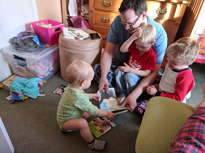 Eliza was helping me move the boys clothes around today. I had to move all of Alex's shirts to Evan's area, and get Alex all new shirts hung up. Eliza was throwing all of the hangers around the room and unfolding clothes I was folding. Such a helpful girl.