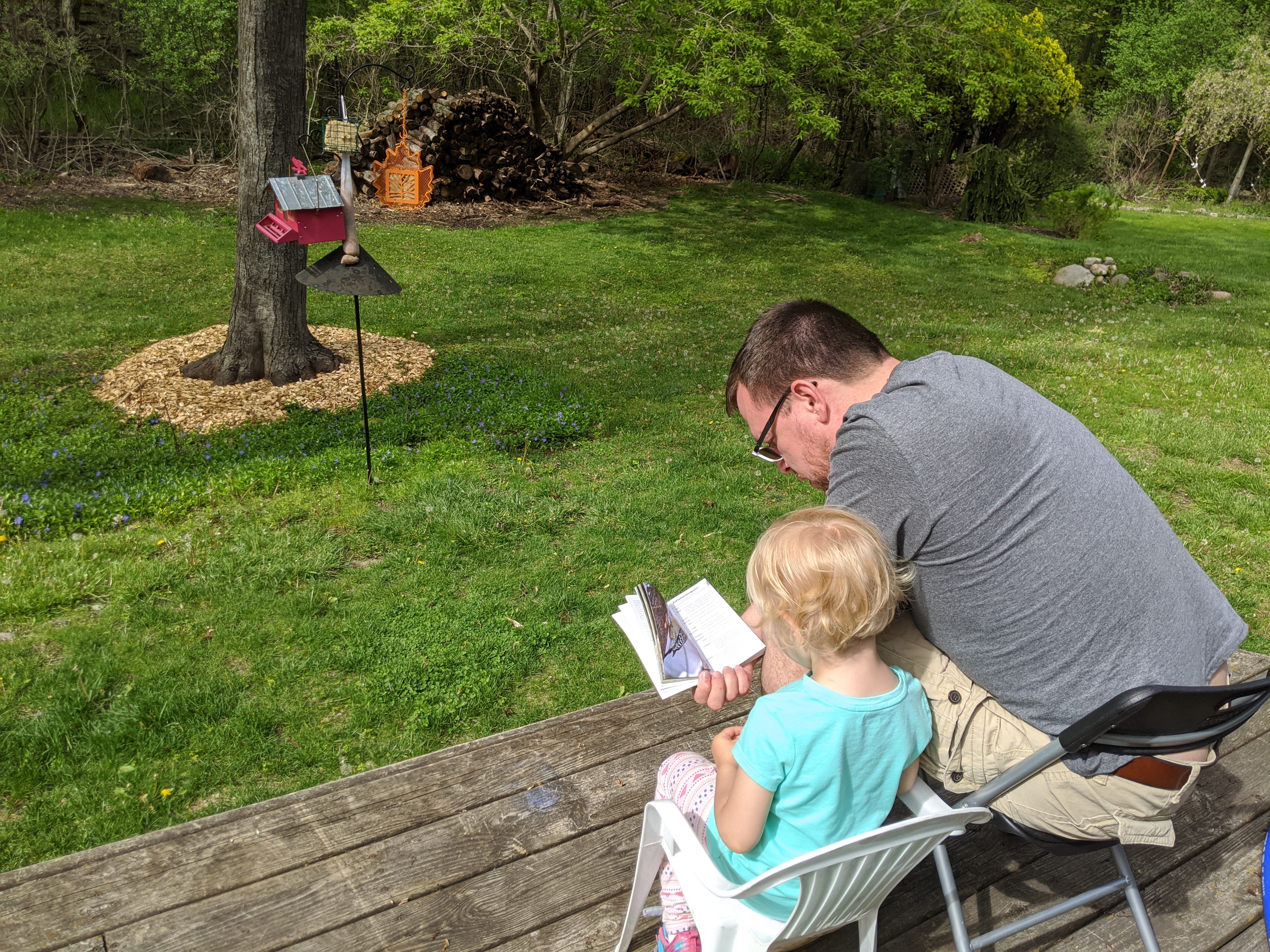 Eliza is really getting into bird watching. She dragged Daddy out with her to look at the birds with her.